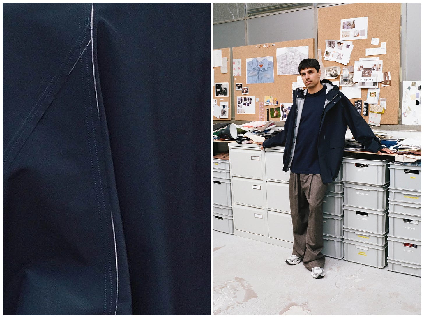 Bringing those two worlds together — you’d expect it to clash. Instead, they click. The result is a tight, thoughtful capsule that feels collaborative rather than compromised. The Satin Gabardine Bal Collar Coat — a mid-length coat featuring CF’s classic raw detailing along the edges and collar, made from a dry double-weave wool gabardine leans heavily Camiel-coded, offering the right amount of mess and chaos. Meanwhile, the 3L Mountain Parka swings back toward Minami — oversized, technical, built from waterproof 3-layer PERTEX SHIELD, and ready for actual weather, while adding raw cuts à la Fortgens.