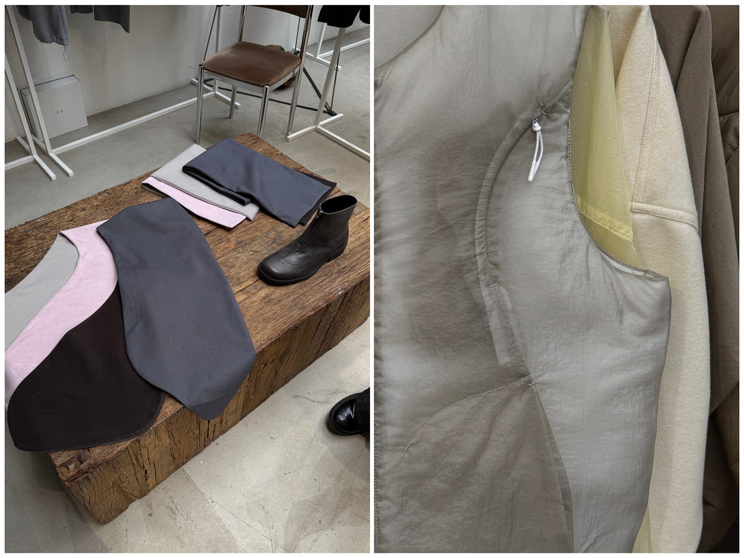 Despite that edge, the brand remains firmly rooted in wearability. “We’re really leaning into this idea of a city escape,” Jeong shared while walking me through the collection. “Good layering pieces — practical, but still refined.” Their nylon, water-resistant puffers, in particular, stood out as ideal options for wetter, windier climates.