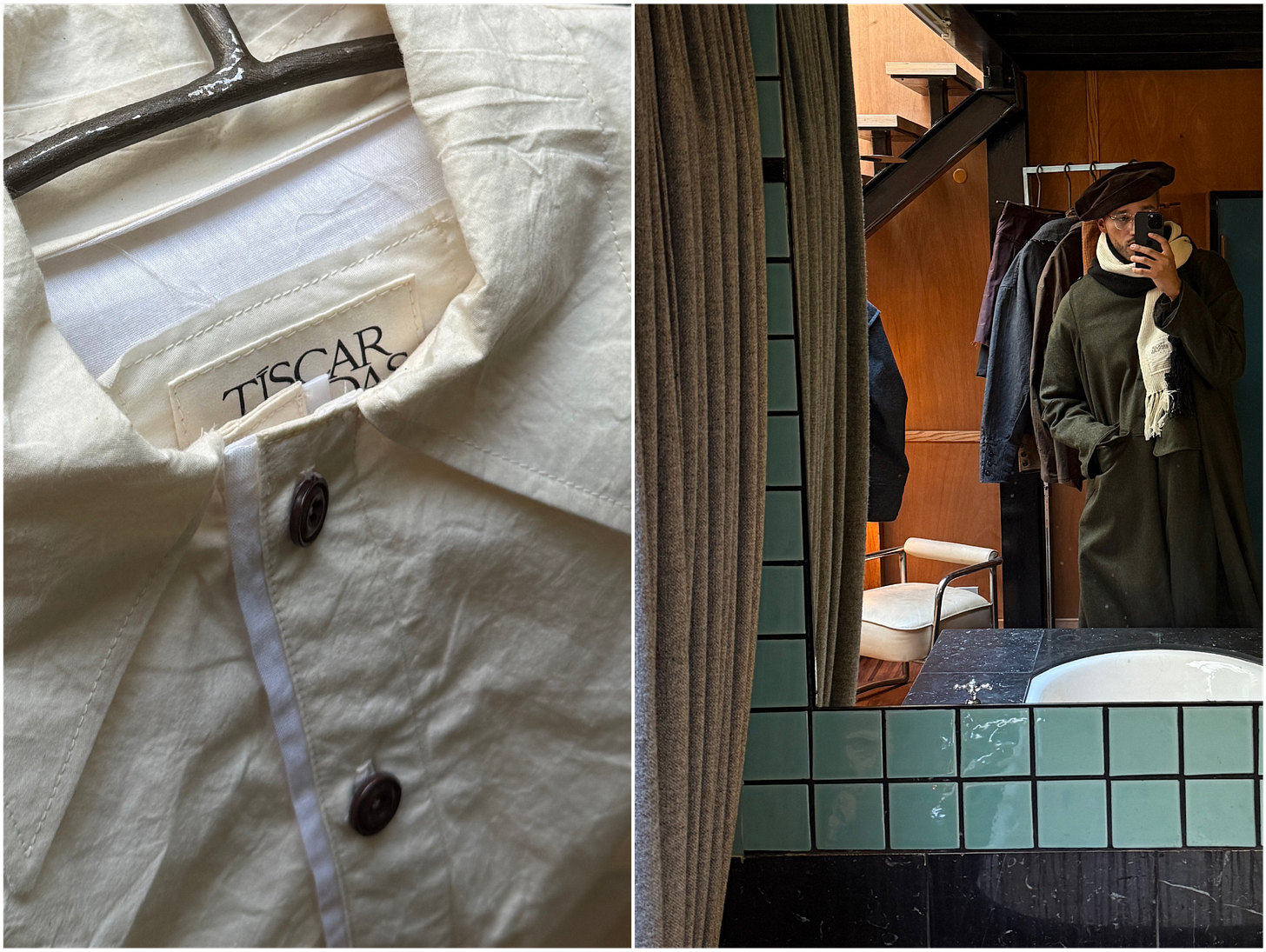 As they say, good things come to those who wait. The two eventually began talking, with Kevin becoming one of Tíscar’s earliest clients. After graduating from the Royal College of Art, where her final student collection quietly became the brand’s first official chapter, they continued writing letters, discussing garments (especially shirts), and building a deeper connection despite living in different countries.